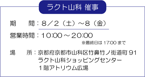 お知らせが遅くなってしまいましたが、8/2(土)から京都「ラクト山科ショッピングセンター」にて新潟物産展を開催中です。