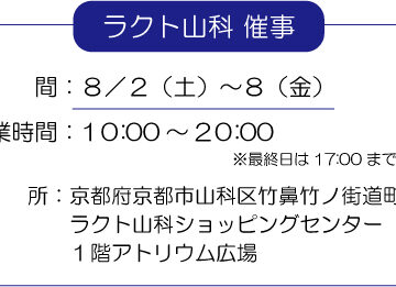 店外出店 8/2~8店外催事のお知らせ(ラクト山科) 日程:2025.8.2 10:00 AM - 2025.8.8 8:00 PM
